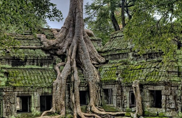 Explore the famous tree-root-covered ruins
